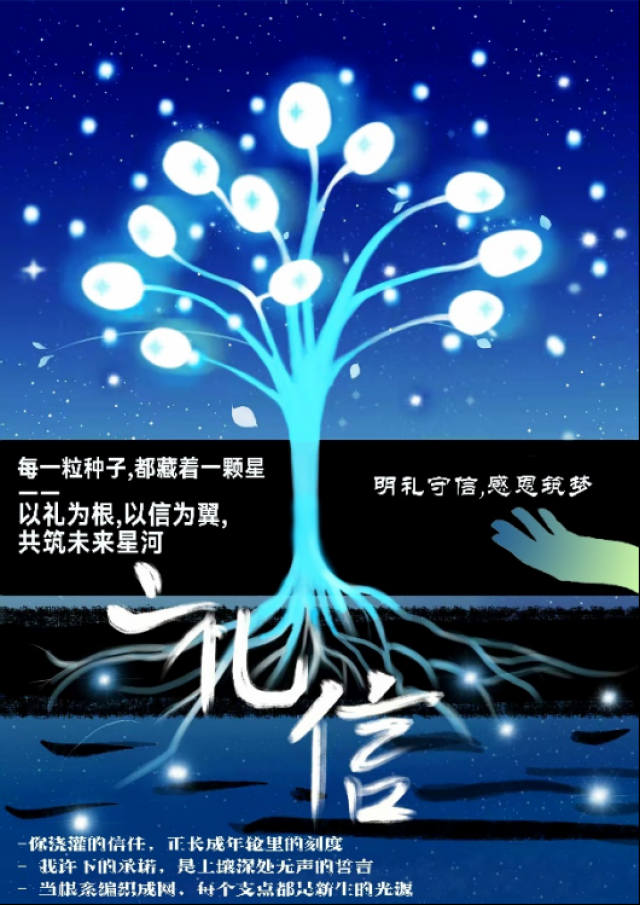 本次大赛以“种子与星光的共生关系”为创作主题,同学们围绕这一核心理念展开设计。其中优秀作品《播种星光,礼传万家》以星空为背景,将种子悬浮成树冠形状,每粒种子内嵌微光,象征被点亮的人生;树根部分以传统书法“礼”字为脉络,根系深入土壤化作数据流,暗喻诚信记录与社会契约,生动展现了“星光-种子-根系”的视觉转化过程。